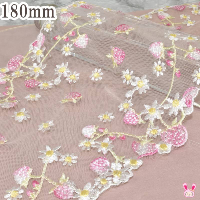 パステル苺と白いお花のレースリボン 幅180mm 10cm単位 切り売り (30cm以上)