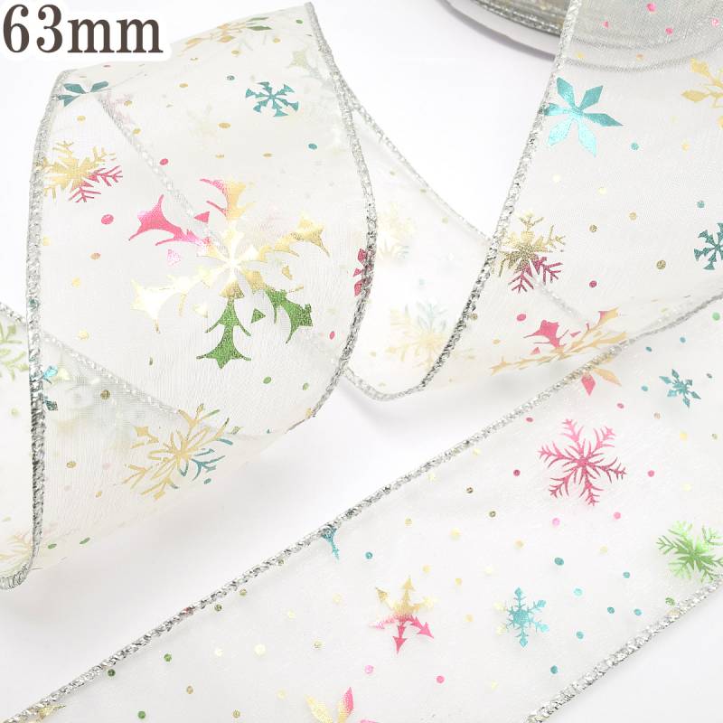 クリスマス ワイヤー入り 七色箔押しのシアー雪リボン 幅63mm 1m単位 切り売り (2m以上)