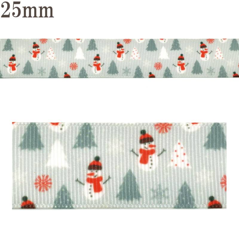 プリントリボン グレーなクリスマスツリーと雪だるまリボン 幅25mm 1m単位 切り売り (3m以上)