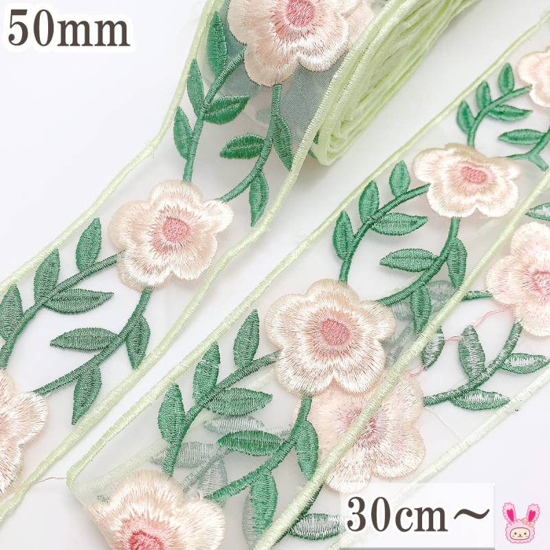 花飾りの刺繍とシアーローズリボン 幅48mm 1m単位 切り売り