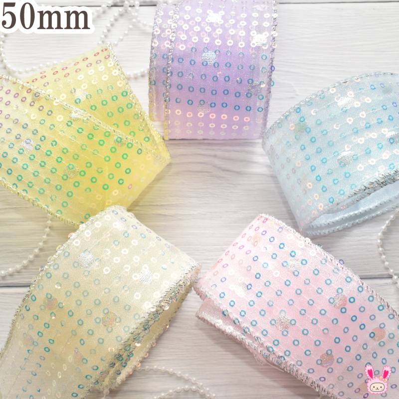 ゆめかわオーロラスパンコール水玉リボン 幅50mm 1m単位 切り売り