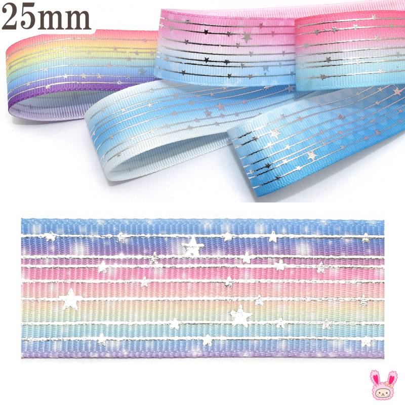 プリントリボン シルバー箔押しラインスターリボン 幅25mm 1m単位 切り売り (3m以上)