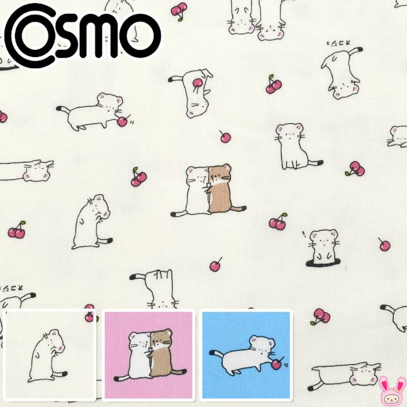 オコジョとさくらんぼ シーチング生地 AP55104-2 コスモ (50cm以上10cm単位切り売り)