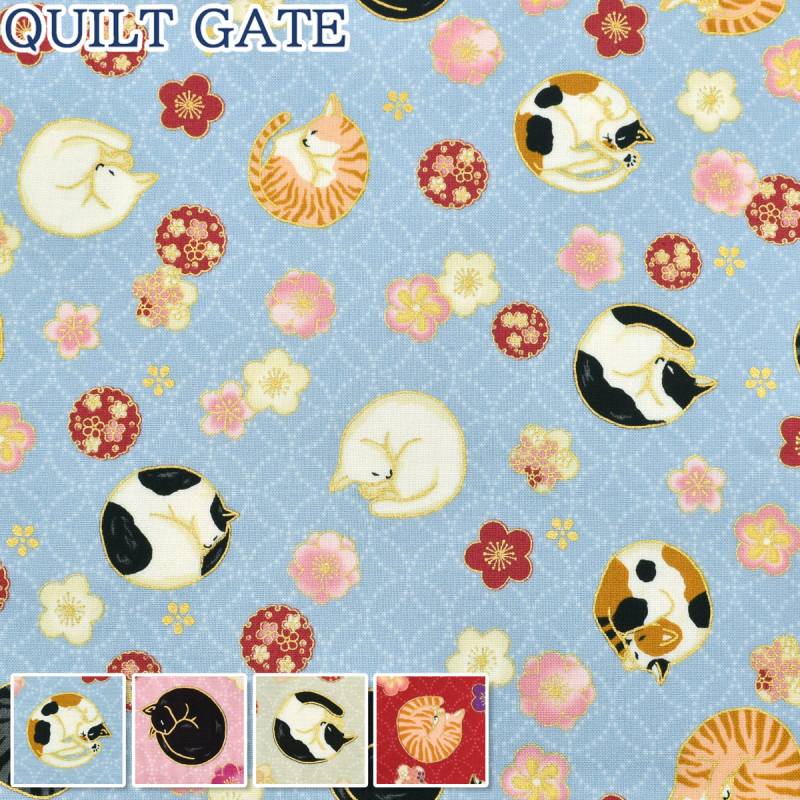 ねこの花眠り シーチング生地 HR3550-12 キルトゲイト (50cm以上10cm単位切り売り)☆
