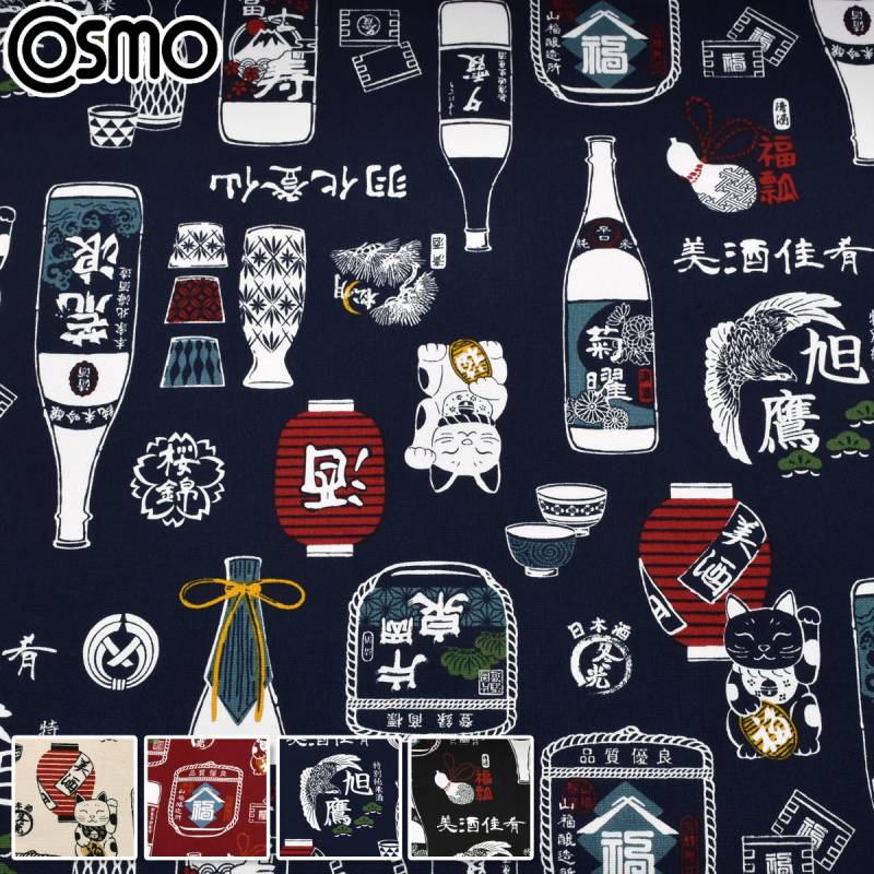 和風な日本酒柄 11号帆布生地 AP61802-2 コスモ (50cm以上10cm単位切り売り)