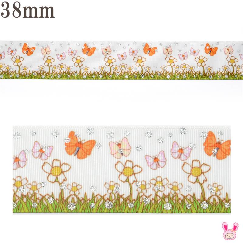 プリントリボン ラメ付きメルヘンなお花とちょうちょリボン 幅38mm 2m [在庫限り]